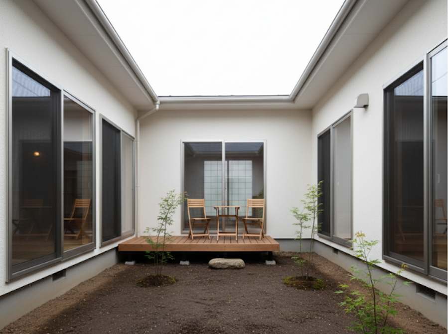 中庭は高い壁や建物で囲まれているため、外部からの侵入経路が限られ、通常の庭よりも防犯面で有利です。窓を中庭側に集中させることで、道路に面した侵入しやすい窓を減らすことができます。
