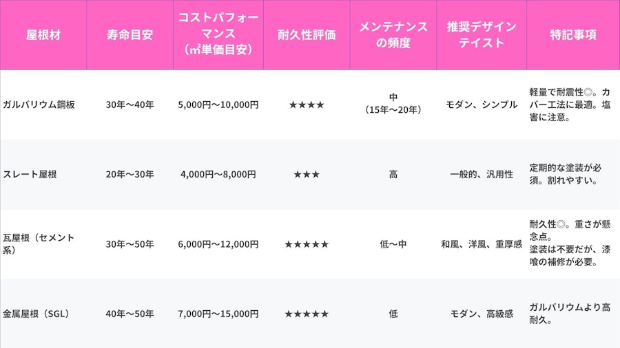 屋根材の選択は、初期費用だけでなく、耐久性やメンテナンス頻度といったライフサイクルコスト(LCC)に大きく影響します。安易に屋根材を選んで、あとから後悔しないよう、屋根材をしっかりと把握して納得して決めることが重要です。