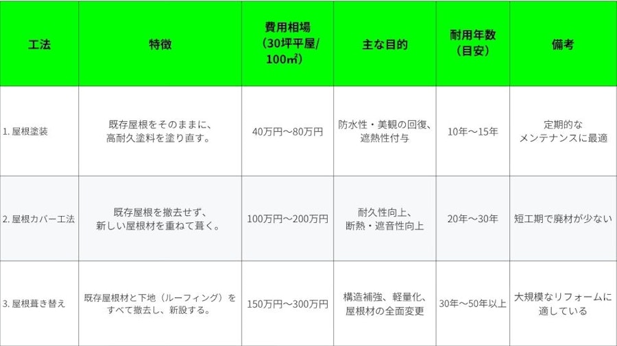 屋根リフォームは、既存の屋根の状態、予算、求める耐久性に応じて、「塗装」「カバー工法」「葺き替え」の3つの工法から選ばれます。