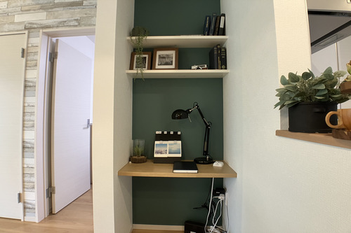 あったら嬉しいスタディカウンター。家族の写真や趣味のフィギア、観葉植物や本などが置ける棚があり、様々なシーンで活躍してくれそうです。