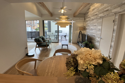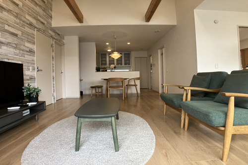 シックなデザインの外観から一歩部屋に入ると自然色が多い室内に思わず笑顔がこぼれてしまいそうです。リビングの天井は勾配天井で高くなっていて、化粧梁も存在感を魅せてくれます。
