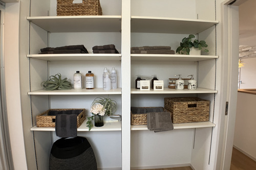 これもあったら嬉しい空間の一つで、IKIにはリネン収納が標準装備でついています。思った以上の収納力ですが、さらに籠や引き出し収納などを活用すると騒動以上の働きをしてくれます。