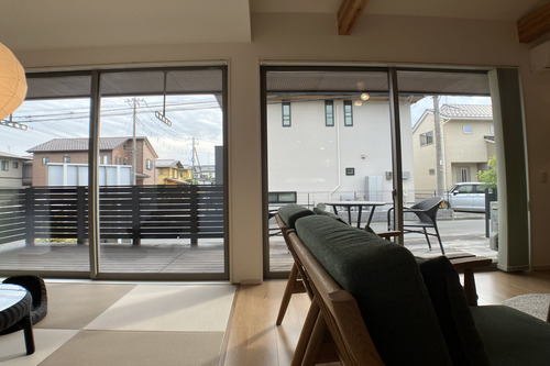リビング横の和室、リビングからは外へ出ることが可能です。行き来がしやすい他、窓が大きく光も大きくはいってきます。IKIの軒は1.3mのため、夏場は太陽の光を直接部屋に入ってくるのを遮り、冬場は適度に光が差し込んで暖かい空間を創ってくれます。