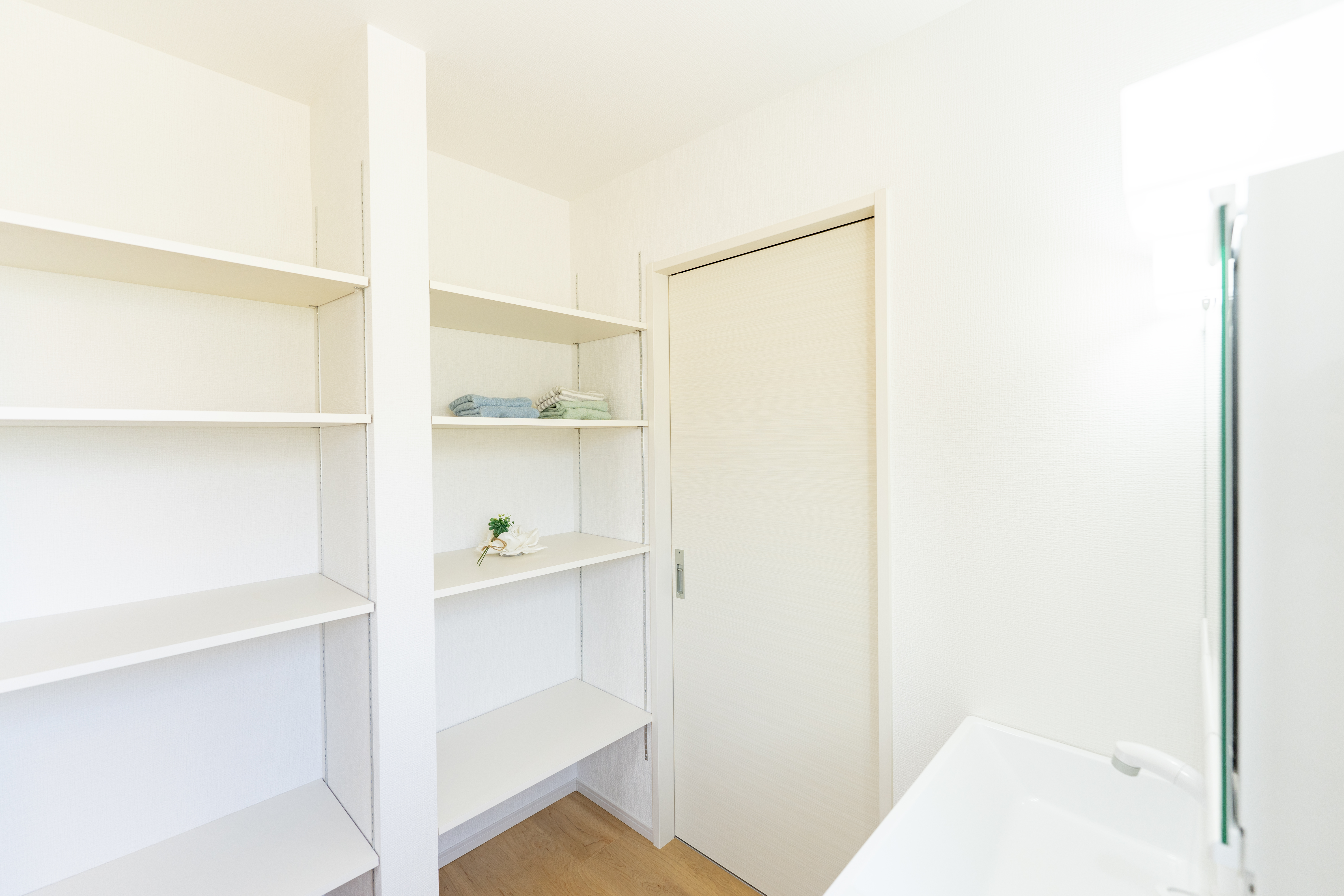 洗面室には、大型のリネン収納スペースが設けられています。IKIシリーズはこういったあったらいいねが、標準でついています。洗濯物や洗剤だけでなく、BOX収納なども活用すると大容量の収納にも変化いたします。