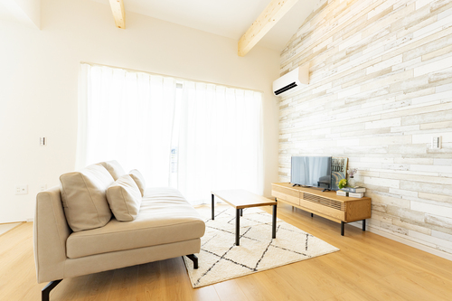 勾配天井の梁と石目調のアクセント壁が、軽やかな抜け感を演出。大開口のレース越しに光が広がり、ソファやTVボードの木質感が心地よくなじみます。シンプルな動線で、くつろぎと家事の両方がはかどるリビングです。