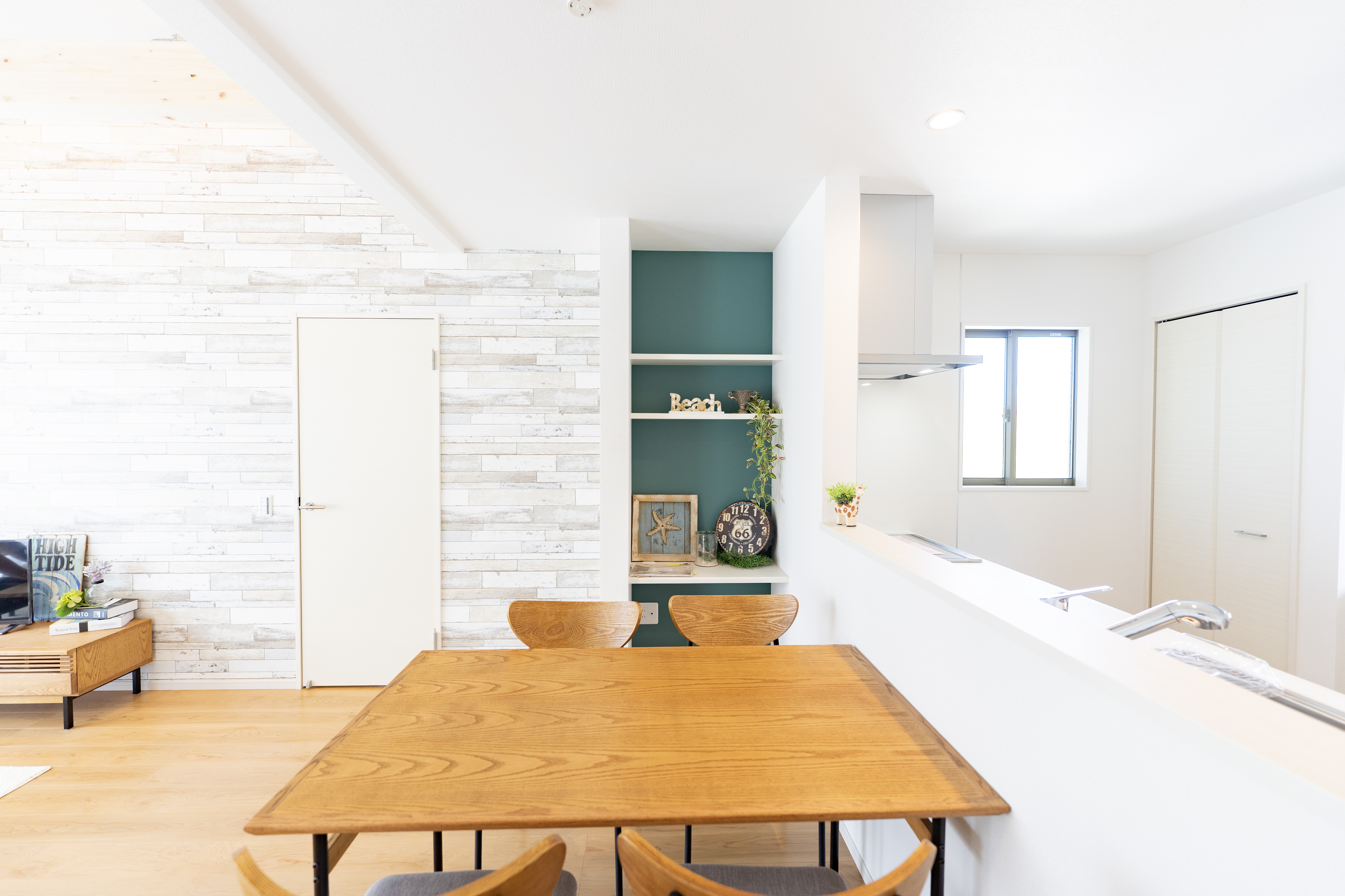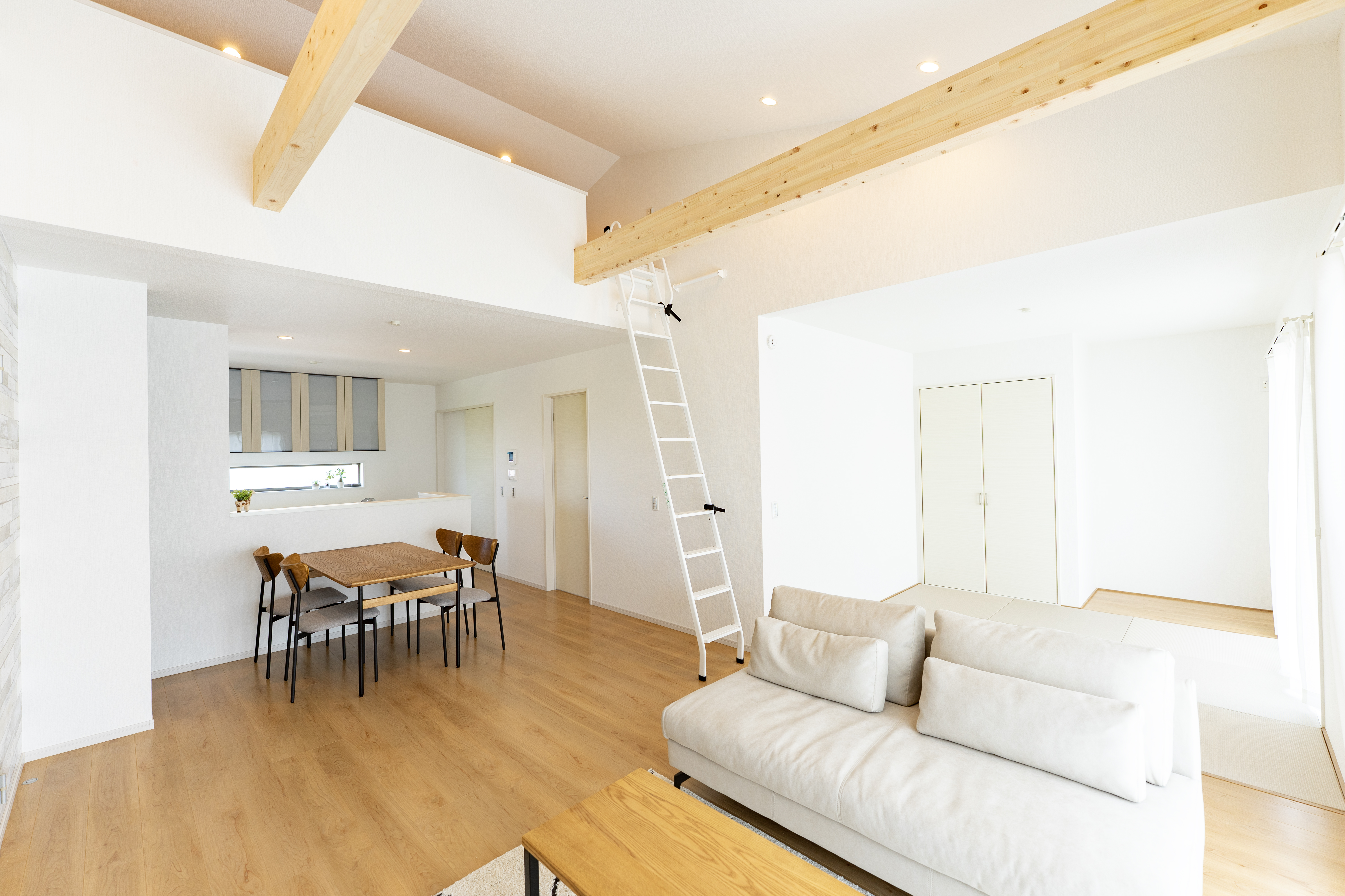 リビング、ダイニングと圧迫感のない空間の中、天井の化粧梁が特徴的で落ち着きと安らぎを与えてくれます。リビングの空間が開放的で自然と家族との会話も増えそうです。