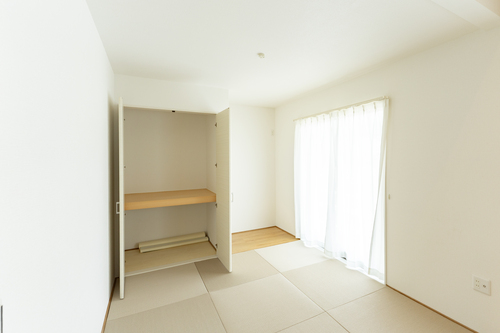 淡色畳とレースカーテンで、やわらかな採光が広がる一室。布団や季節物をしまえるクローゼット付きで、客間・子どもスペース・在宅ワークまで多用途に活躍。必要なときにサッと片づき、暮らしが整います。