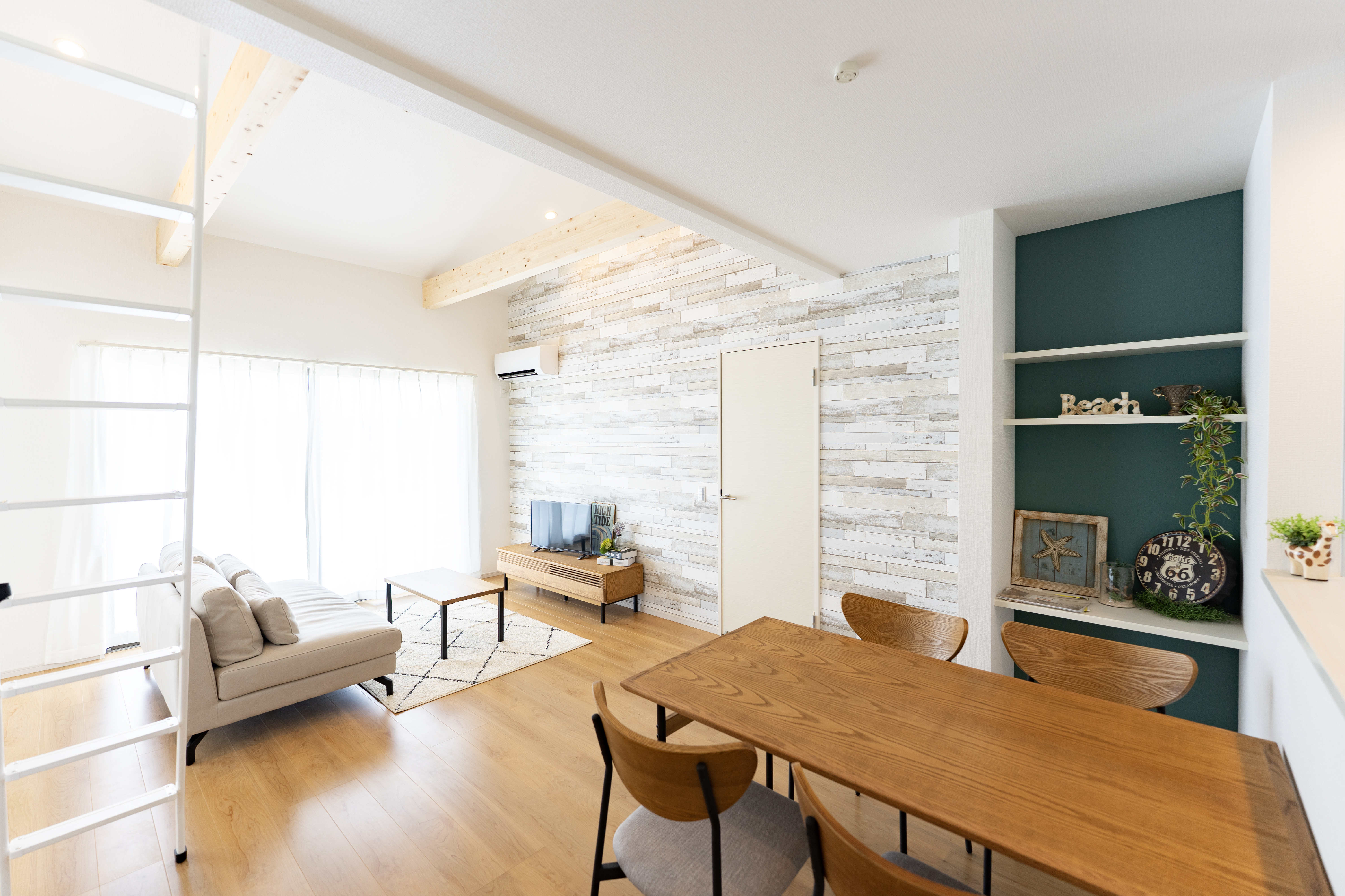 リビングをぐっと開放的に魅せる勾配天井。27坪とは思えない解放感を体感できます。木目調のアクセントクロスはまるでカフェのような空間を演出し、家族や友人とのおしゃべりも弾みます。